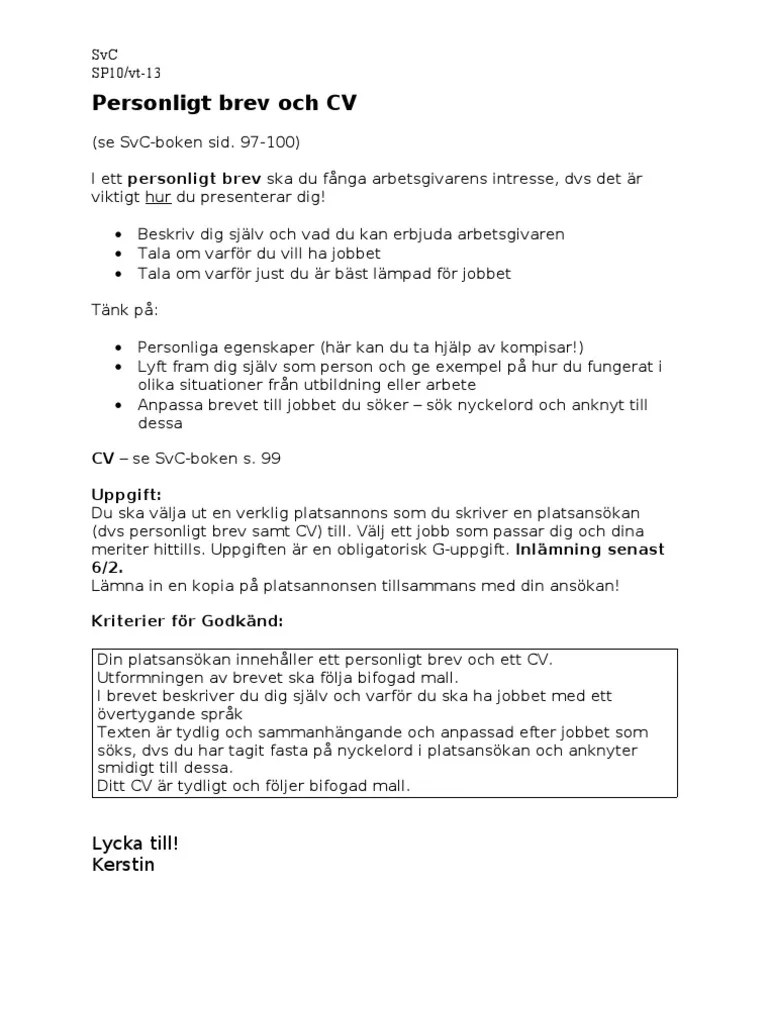 För att förbättra dina chanser att bli kallad till intervju finns det några grundläggande saker du kan tänka på när du . Vad du ska undvika i ett personligt brev; Till exempel att hen utvecklat stresståligheten i sitt kundtjänstarbete. Vad ska ett personligt brev innehålla? · ge tydliga exempel på dina .